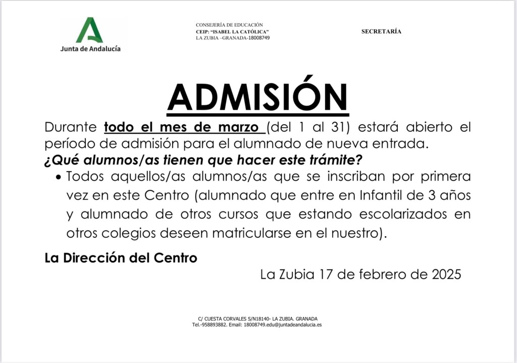 Los impresos de solicitud de admisión, el formulario para la elección de religión y el cuestionario de matriculación para Infantil de 3 años están disponibles en nuestra página web y en la secretaría del CEIP Isabel la Católica de La Zubia.